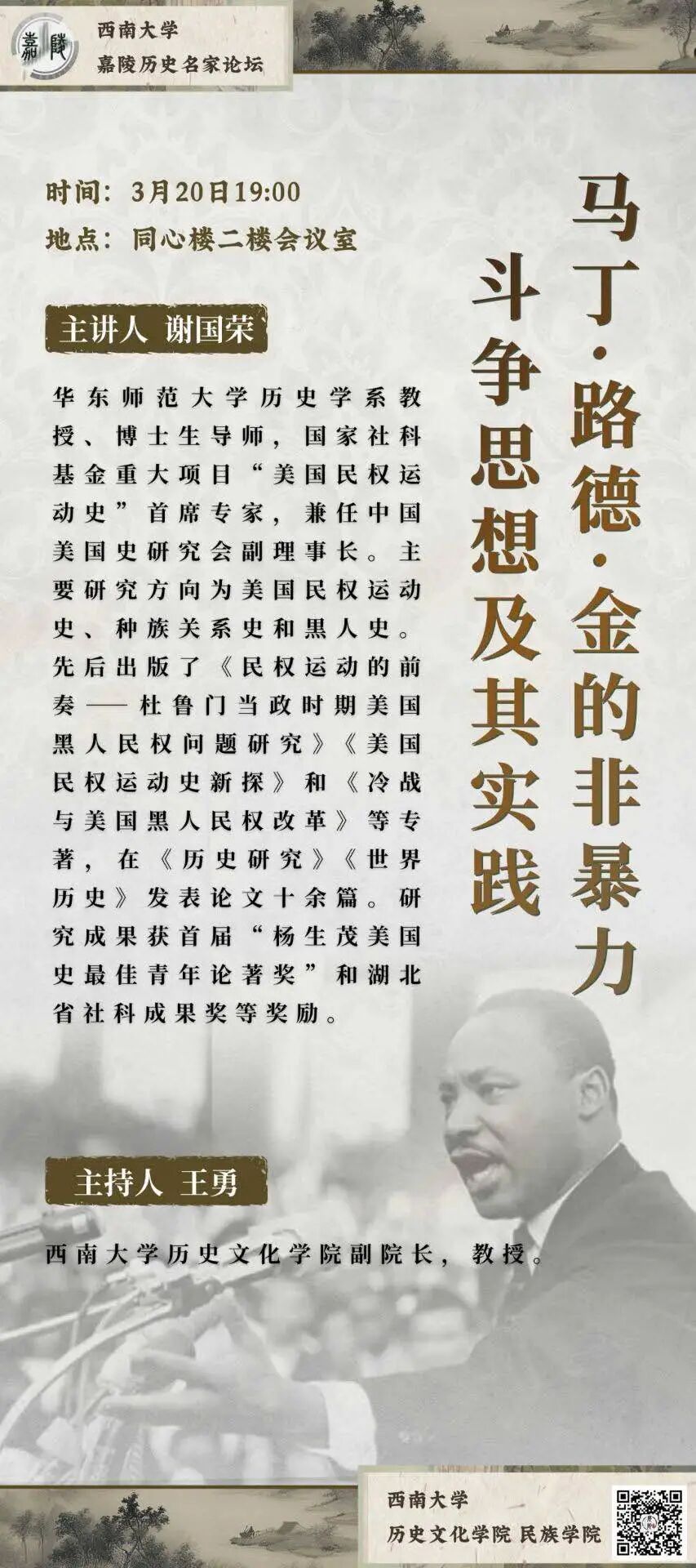 谢国荣,华东师范大学历史学系教授、博士生导师,国家社科基金重大项目“美国民权运动史”首席专家,兼任中国美国史研究会副理事长。主要研究方向为美国民权运动史、种族关系史和黑人史。先后出版了《民权运动的前奏——杜鲁门当政时期美国黑人民权问题研究》《美国民权运动史新探》和《冷战与美国黑人民权改革》等专著,在《历史研究》《世界历史》发表论文十余篇。研究成果获首届“杨生茂美国史最佳青年论著奖”和湖北省社科成果奖等奖励。