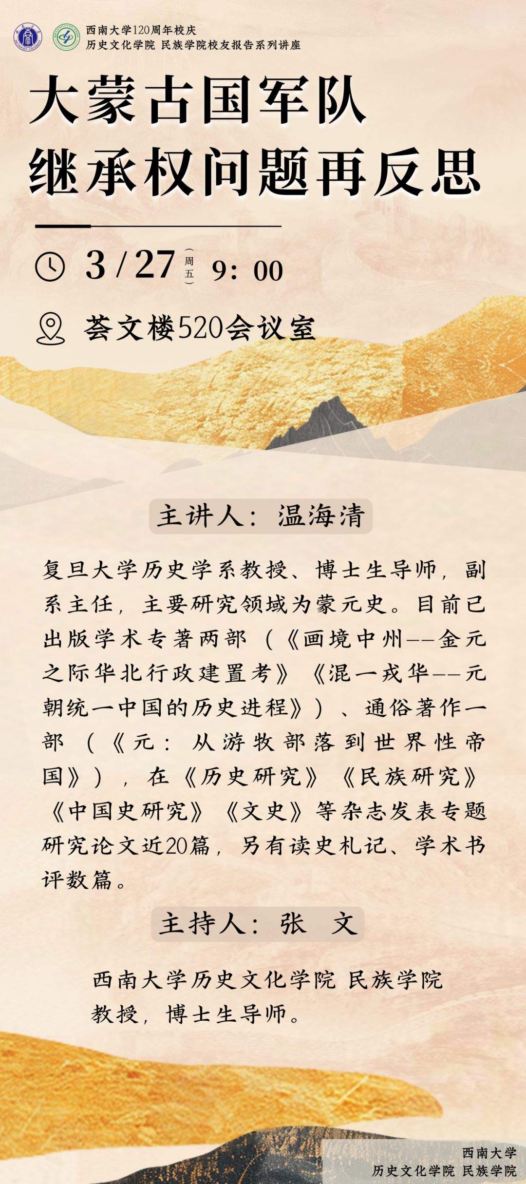 温海清,复旦大学历史学系教授、博士生导师,副系主任,主要研究领域为蒙元史。目前已出版学术专著两部(《画境中州——金元之际华北行政建置考》《混一戎华——元朝统一中国的历史进程》)、通俗著作一部(《元:从游牧部落到世界性帝国》),在《历史研究》《民族研究》《中国史研究》《文史》等杂志发表专题研究论文近20篇,另有读史札记、学术书评数篇。